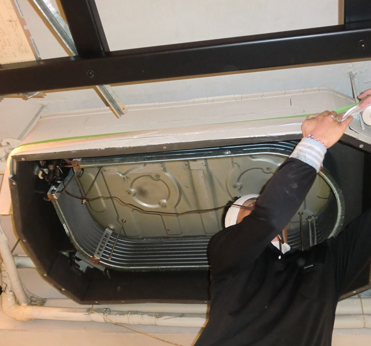 そこで、当社では化粧パネル・ドレンパン・ファン、電装部品など熱交換器以外の全てを取り外し洗浄します。 熱交換器を高圧洗浄し、取り外したパーツを洗浄して、最後に防カビ